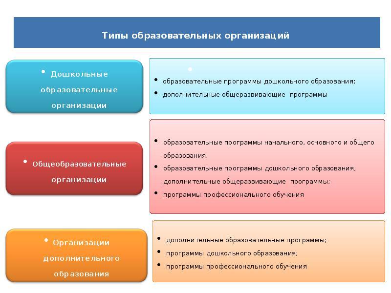Есть несколько типов образовательных учреждений, которые предоставляют образовательные услуги:
