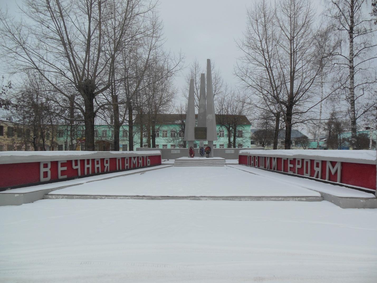 У поселковой администрации по улице Дзержинского к 40-летию Великой Победы был открыт мемориал погибшим войнам и партизанам в годы Великой Отечественной войны. Мемориал памяти расположен недалеко от проходной комбината, откуда в первые месяцы войны были мобилизованы в ряды Красной Армии жители нашего посёлка-более 50 рабочих конбината. Имена воинов –освободителей нашей земли золотыми буквами высечены на мемириальных досках у памятника. Вечный огонь горит в память о тех,кто ценой выковал Победу для нашего народа.