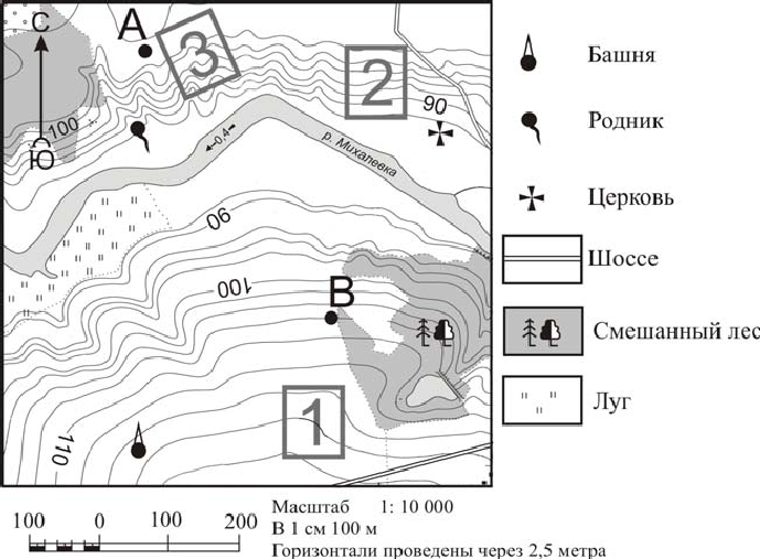 5. Определите расстояние на плане от точки А до башни. Измерение проводите между центрами условных знаков.