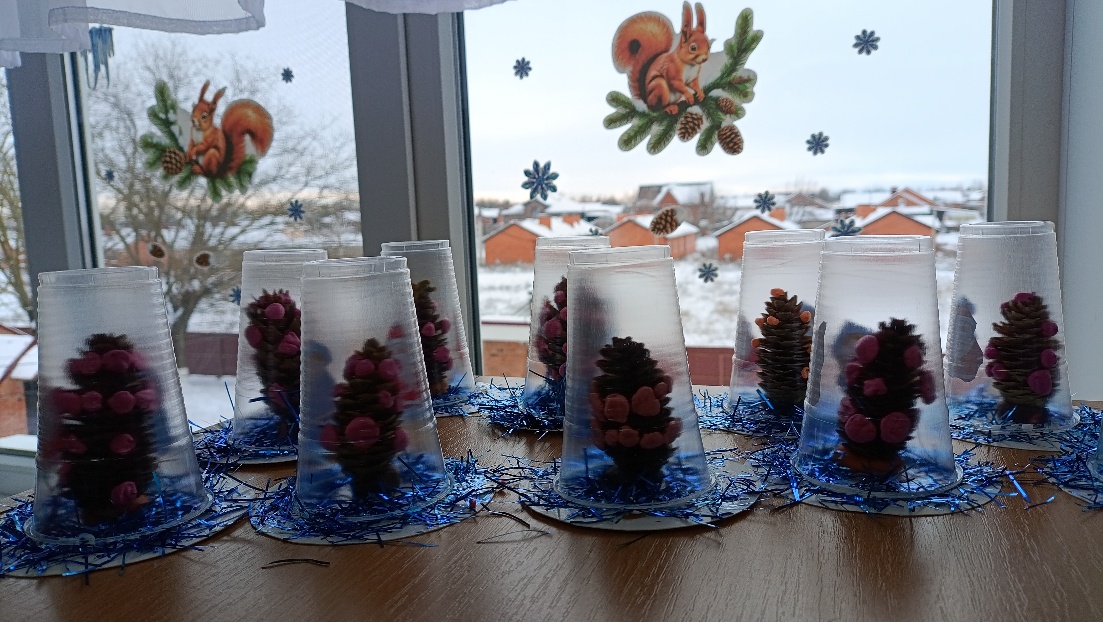 Материалы: одноразовые прозрачные стаканчики, шишки, пластилин, ножницы, клей, мишура, картинки Деда Мороза и Снегурочки, белый картон.