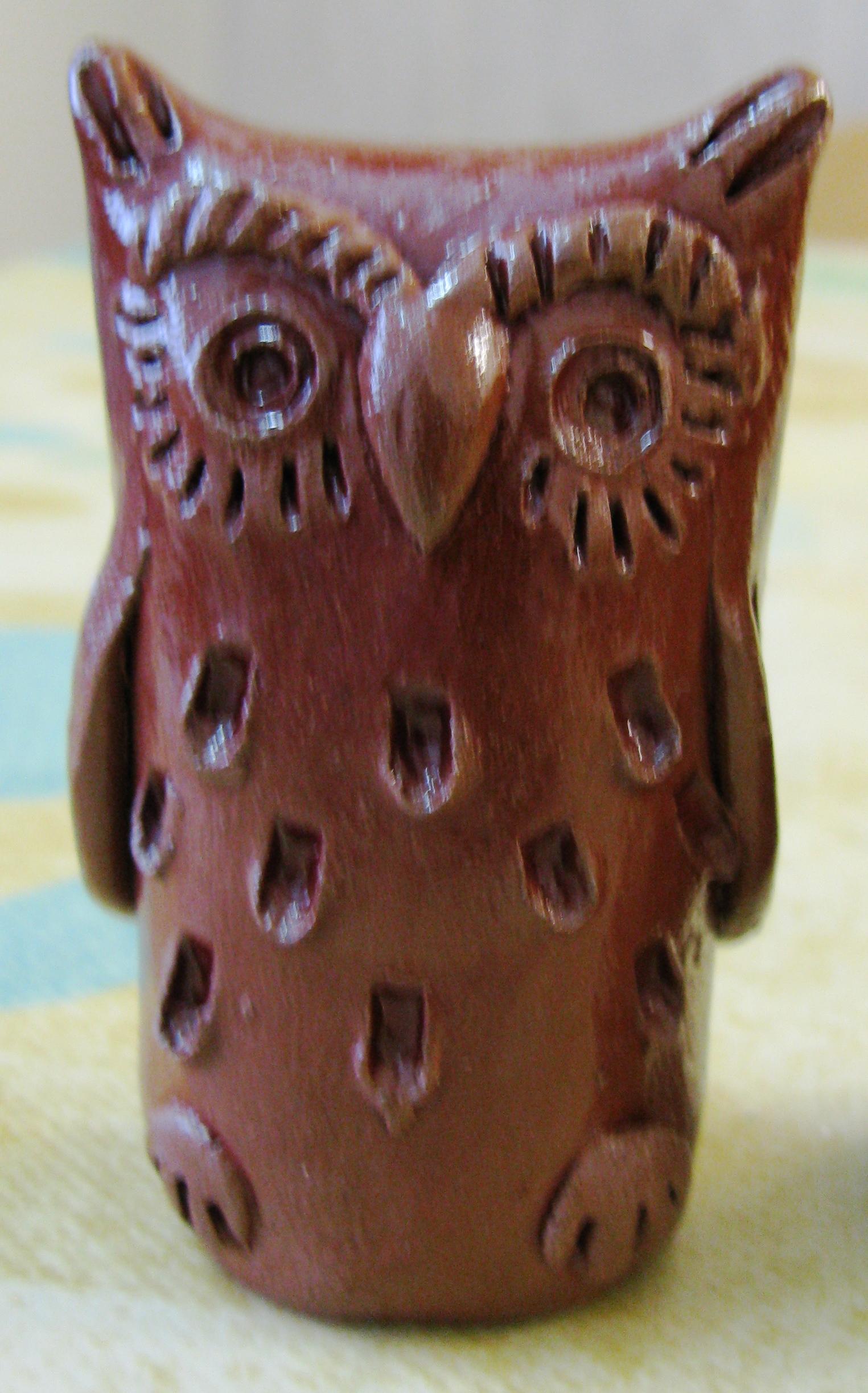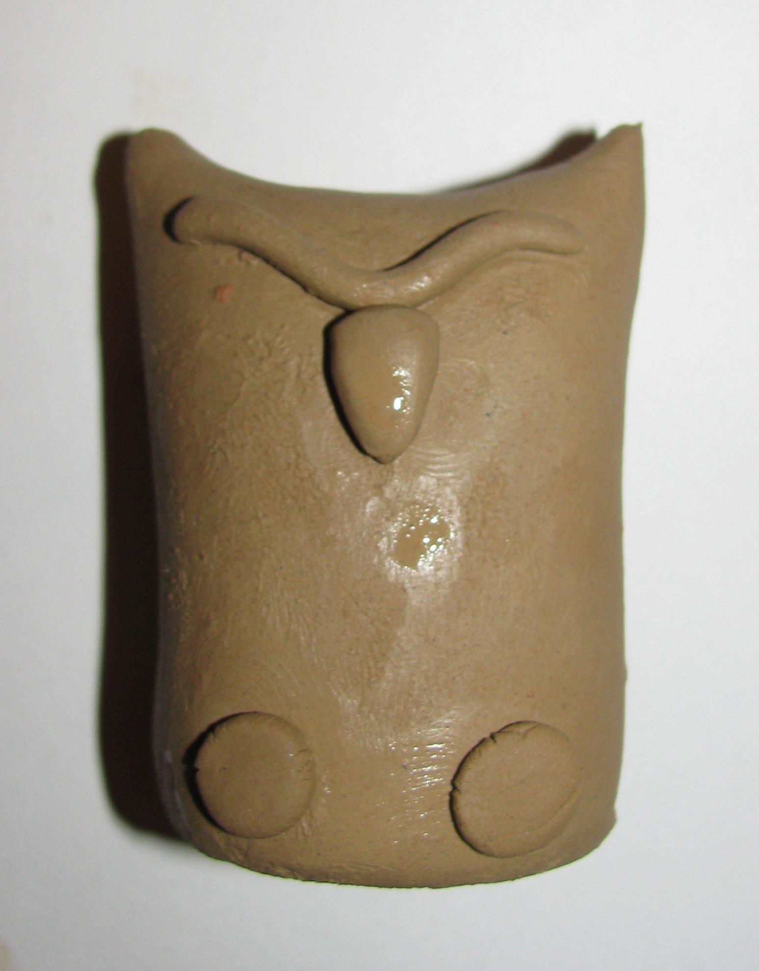 | 3. | Объяснение выполнения задания: Для её изготовления нужно взять небольшой кусок глины и хорошо размять его руками, чтобы удалить лишние пузырьки воздуха. Затем ладонью раскатать на столе толстый жгутик. В середину боковой стороны жгута вставить круглый стек и, нажимая на стек, начать осторожно катать жгут пока отверстие не расшириться. Дальше нужно проверить толщину стенок будущей свистульки. Она должна быть одинаковая. На следующем этапе работы прижимаем одну сторону тела совы к другой – это голова, полностью закрываем нижнюю часть игрушки, несильно стучим ею по столу, чтобы сова ровно стояла на нем. Затем приступаем к выравниванию и заглаживанию тела игрушки. Для этого берем изделие в левую руку. Большим пальцем правой руки по направлению от себя делаем поступательные движения по форме игрушки. Также можно использовать для этого поролоновую губку. Потом выполняем оставшиеся детали. Ладонью катаем тонкие жгуты для бровей, крыльев. С помощью шликера прикрепляем их на место. Добавляем клюв, бусины используем для лап и хвоста. Следующий этап – тиснение узора. Желательно тиснить изделие неглубоко, достаточно легкого нажима. Для глаз используем круглый стек. Украшаем тонким прямоугольным стеком брови и лапы птицы, придумываем перья. Для декорирования деталей стек осторожно прикладываем к поверхности, ничего не царапаем. В подготовленном для свистка месте на расстоянии 5-7 мм от основания тела птицы делаем глухой прокол. Осторожно удалив палочку и поправив края, приступаем к проколу сквозного отверстия. Секрет заключается в том, что при проколе сквозного отверстия палочка должна упираться в острый край тупикового отверстия. После удаления комочка глины, образовавшегося при проколе, вглядевшись в сквозное отверстие, вы должны видеть острый край глухого отверстия посередине прокола. А теперь проверяем звук получившейся свистульки. | Пед. показ | 8 -10 |