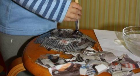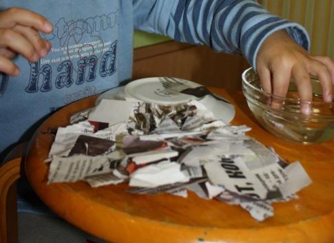 Данная техника создания бумажных поделок немного проще и занимает меньше времени, чем предыдущая. Она не требует предварительного замешивания теста. Просто нарвите множество полосок и кусочков из газетной бумаги, приготовьте тарелку-форму, миску с водой комнатной температуры и клей ПВА или обойный.