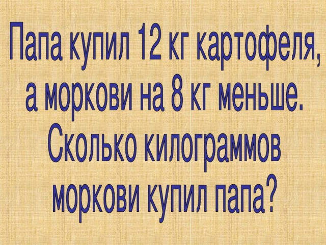 Папа купил 12 кг картофеля, а моркови на 8 кг меньше. Сколько килограммов моркови купил папа?