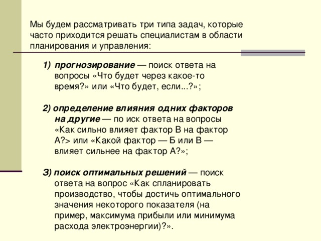 Мы будем рассматривать три типа задач, которые часто приходится решать специалистам в области планирования и управления: