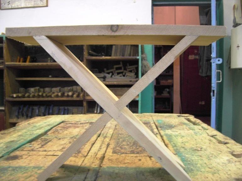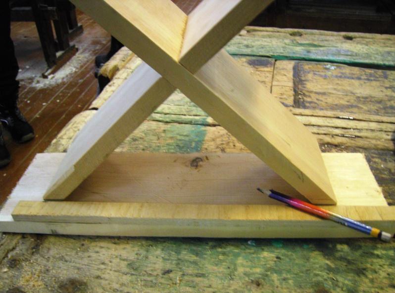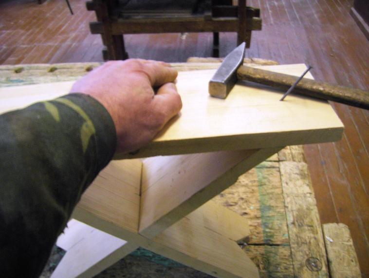 10. Вновь собираем ножки в одно целое (крестовина), примеряем сидение. Прижав с усилием сидение к «ножкам», закрепляем его на гвозди или шурупы.
