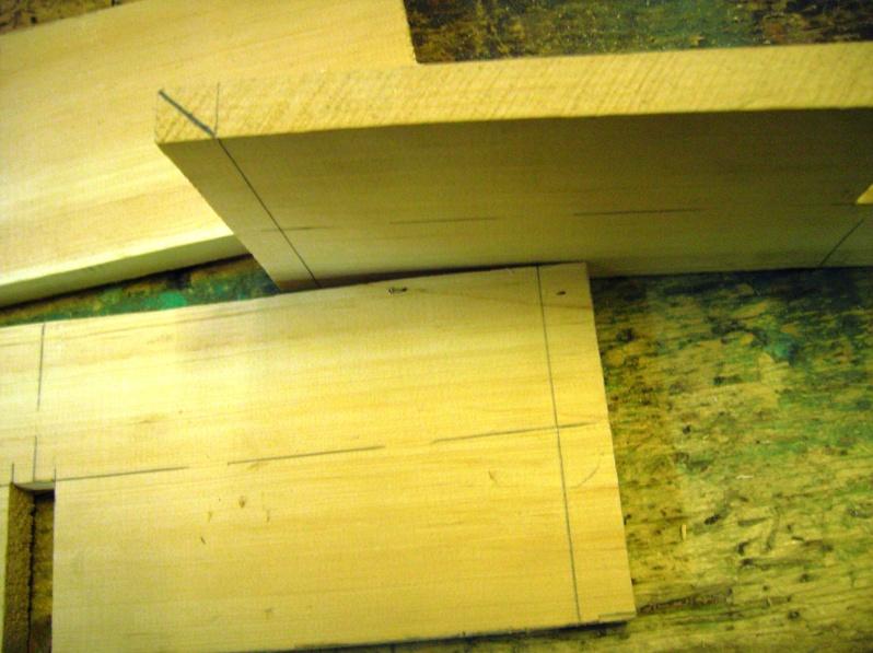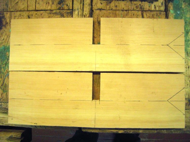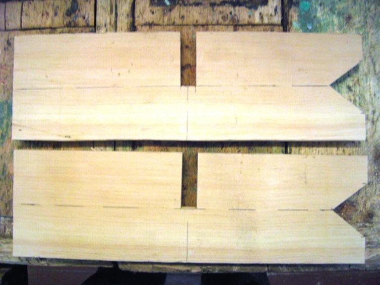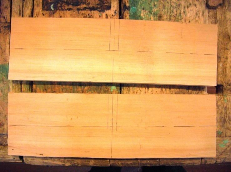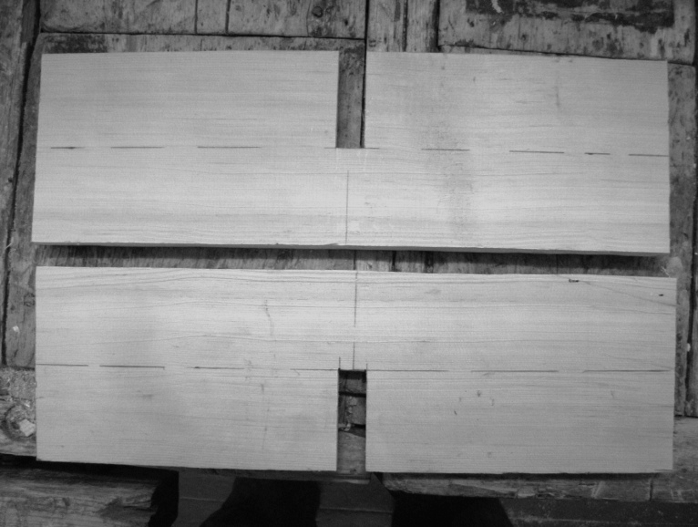 2. На двух подготовленных досках (острожены, отрезаны по 40 см длиной) размечаем осевую и поперечную линии ровно пополам. На поперечной линии размечаем по толщине доски место соединения.