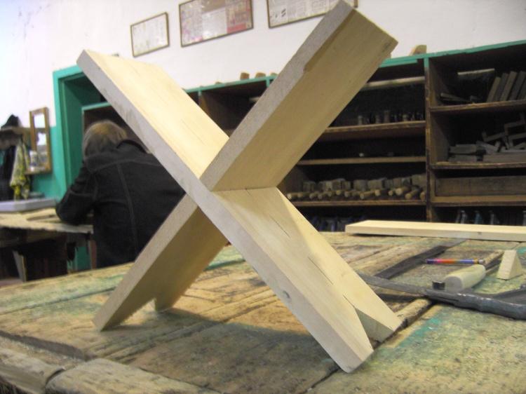 Соединение «вполдерева» по центру ножек. Сидение закрепляется двумя шурупами, или двумя гвоздями. Высота готового изделия 29 - 30 см.