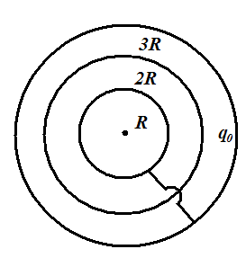 Задача 2. Три концентрические проводящие сферы имеют расдиусы R, 2R и 3R. Внутренняя и внешняя не заряжены, заряд средней сферы равен q0. В некоторый момент внутреннюю и внешнюю сферы соединяют проволокой (рис). Какой заряд пройдет по этой проволоке, и какое при этом выделится количество теплоты?