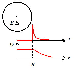 Задачи с проводящими сферами можно успешно решать имея знания в пределах школьной программы. Проводниками называют такие материалы, в которых имеются свободные носители зарядов. Если сообщить заряд проводящему телу то свободные заряды перестают перемещаться вдоль поверхности проводящего тела при достижении такого их распределения, при котором вектор напряженности электрического поля в любой точке перпендикулярен поверхности тела. Поэтому в электрическом поле поверхность проводящего тела любой формы является эквипотенциальной поверхностью. Все точки внутри проводника имеют одинаковый потенциал, равный потенциалу на его поверхности. Если заряд на поверхности проводящего шара равен q, то электрическое поле вне шара такое же, как поле точечного заряда q находящегося в центре проводящего шара. Напряженность и потенциал графически распределены на рисунке. Потенциал сферы