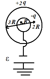 Задача 1. В системе, состоящей из двух концентрических проводящих сфер радиусом R и 3R (рис.), внутренняя сфера соединена с землей через источник с ЭДС ε. Заряд внешней сферы +2q. На расстоянии 2R от центра системы находится точечный заряд –q. Зная величины q, ε, R, определите заряд внутренней сферы. Потенциал земли принять равным нулю.