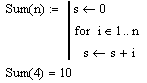 Задайте сначала имя функции Sum, вслед за которым введите список параметров (n) и оператор присваивания :=