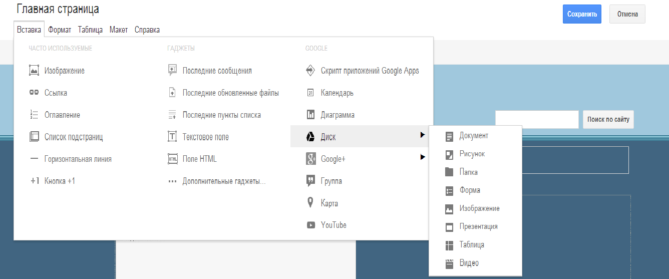 В любое место на новом сайте вы сможете добавить гаджеты от Google и свои файлы: это и календари, и слайд шоу, материалы из Гугл диска, местоположение на карте и прочее.