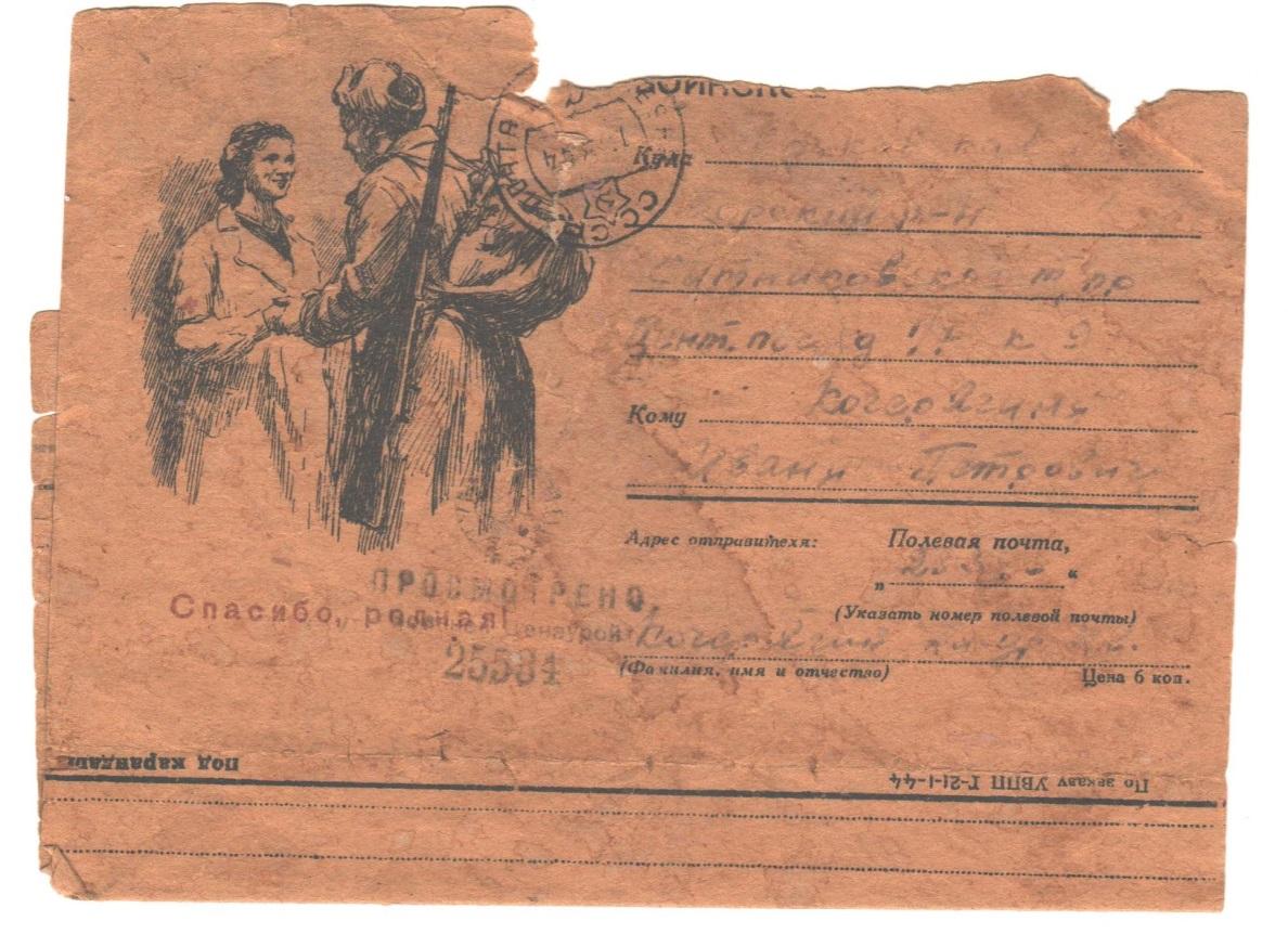 Письмо с фронта Кочерягина И.П. 1944 г.