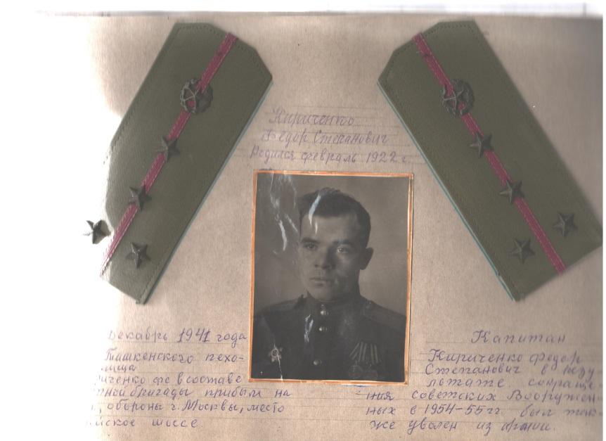 В ноябре – декабре 1941 года был курсантом ташкентского пехотного училища. В это время была сформирована 34 – я стрелковая курсантская бригада. Стали готовиться на фронт. В начале ноября 1941 года нас погрузили в эшелон и нас направили на фронт. Ехали не зная куда. Приехали мы в Москву. Нашу бригаду переодели в зимнюю одежду так как уже стояла настоящая холодная зима. После бани немного отдохнули и пешком пошли через город. Прошли Красную площадь, по другим улицам столицы и прибыли на место. Задача была поставлена: «Ни шагу назад!» Начали рыть окопы в районе Можайского шоссе. Здесь проходила шоссейная дорога в Волоколамском направлении.