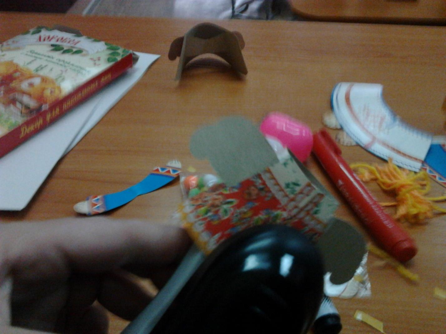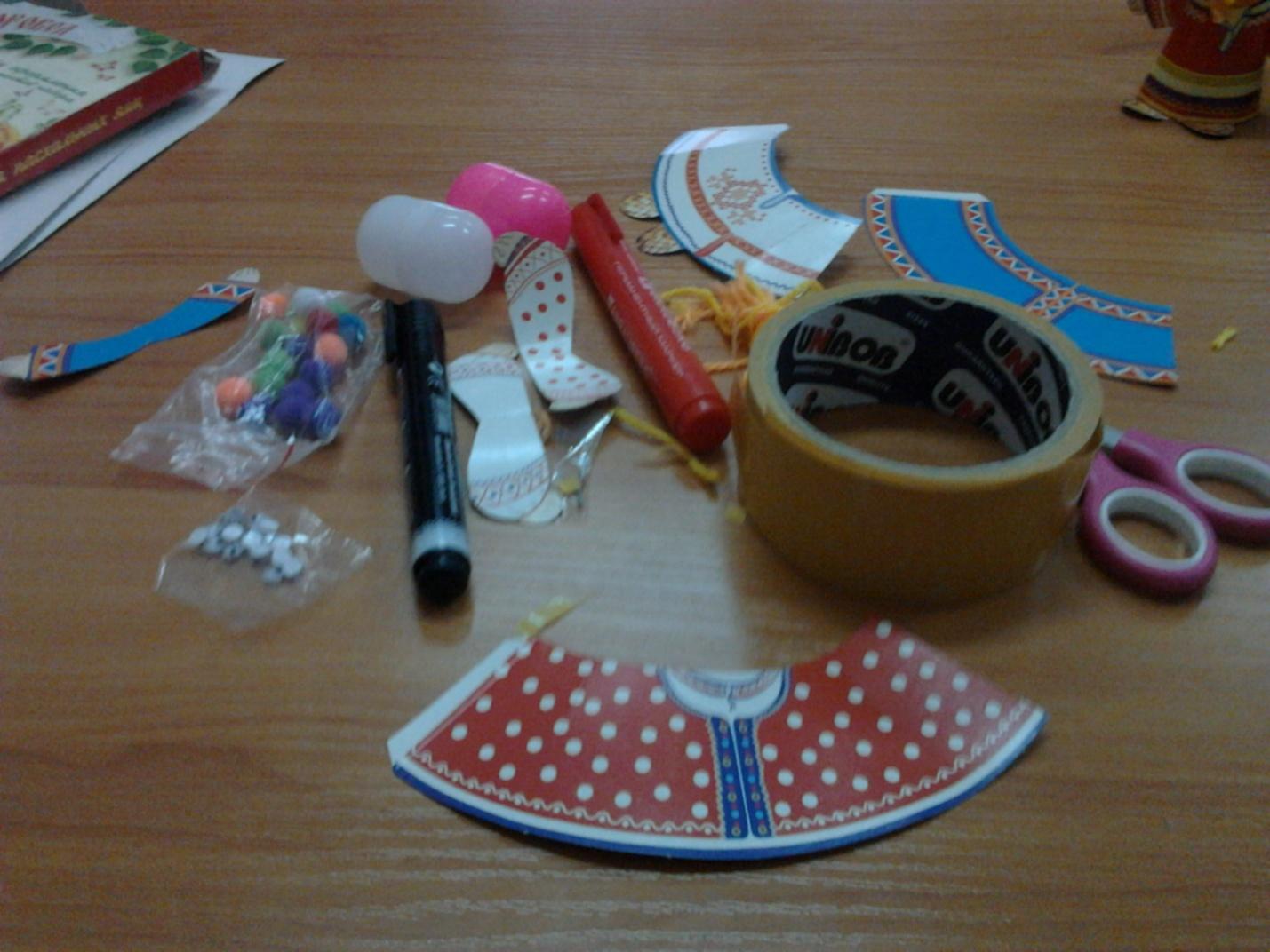 Материал: цветной картон, ножницы , клей, декоративные украшения(маленькие меховые шарики, глазки, шерстяные нитки), скорлупки от яиц или пластиковые яйца из киндер-сюрпризов, двусторонний скотч, маркеры красного и чёрного цвета.