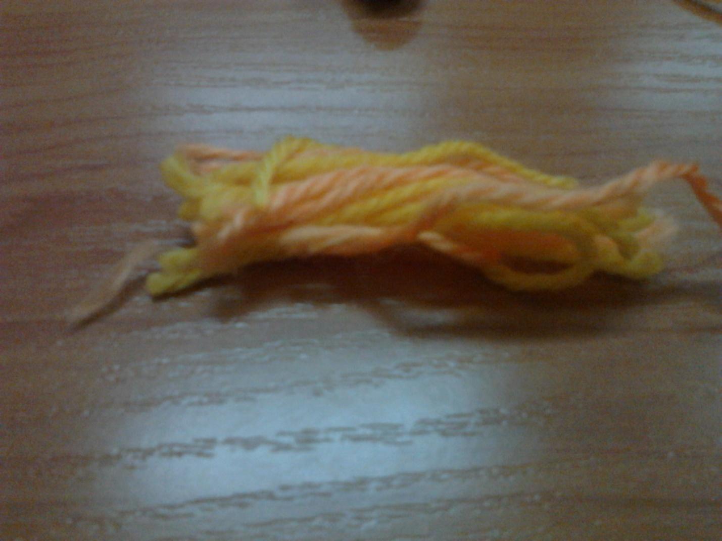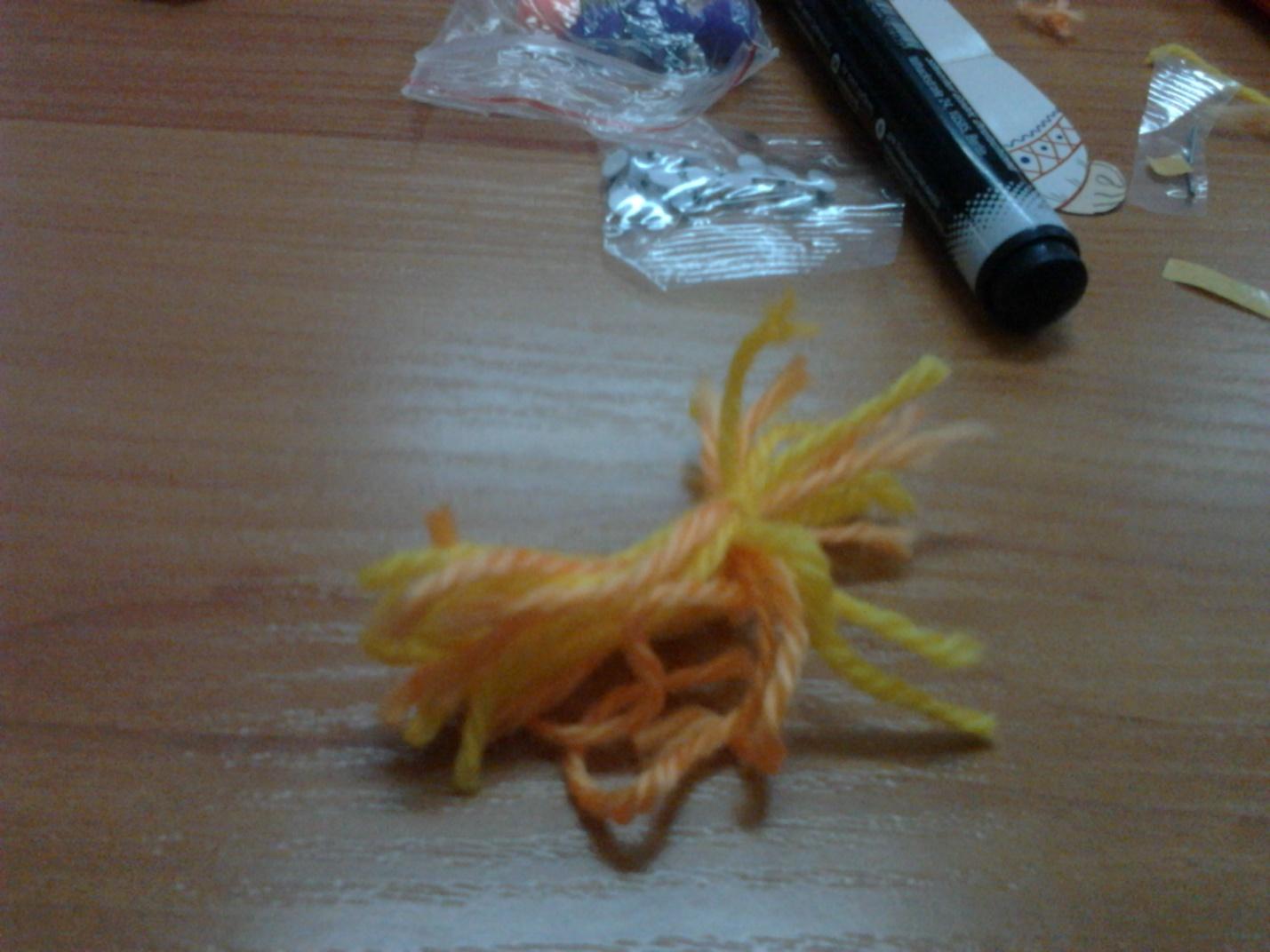 Дальше сделаем парик для нашего человечка из шерстяных ниток оранжевого цвета.