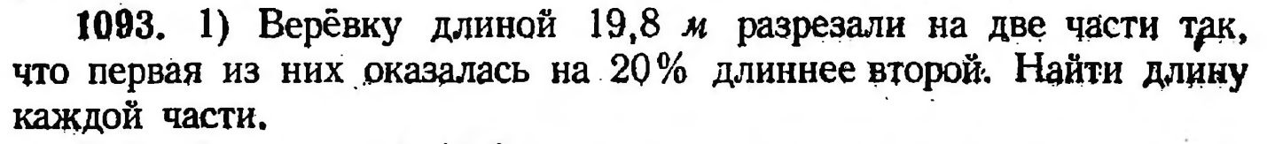 №4. Веревку длиной 19,8 метра разрезали на 2 части так, что первая из них оказалась на 20% длиннее второй. Найти длину каждой части.