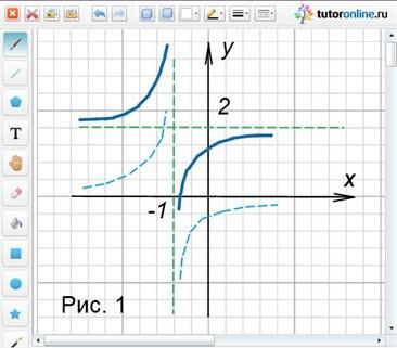 Теперь легко видеть, что график этой функции получается из графика функции y = 1/x следующими преобразованиями: сдвигом на 1 единицу влево, симметричным отображением относительно Ox и сдвигом на 2 единичных отрезка вверх по оси Oy.