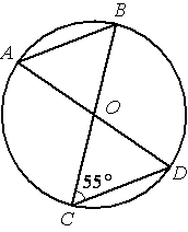 | 1. В окружности с центром в точке О проведены диаметры AD и BC, угол OCD равен 55°. Найдите величину угла OAB. |  |