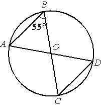 | 14. В окружности с центром в точке О проведены диаметры AD и BC, угол ABO равен 55°. Найдите величину угла ODC. |  |