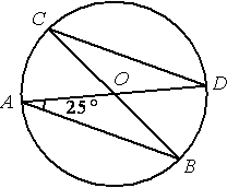 | 15.В окружности с центром в точке О проведены диаметры AD и BC, угол OAB равен 25°. Найдите величину угла OCD. |  |