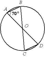| 16. В окружности с центром в точке O проведены диаметры AD и BC, угол OAB равен 70°. Найдите величину угла OCD. |  |
