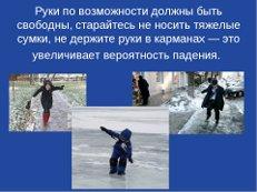 • Руки по возможности должны быть свободны, старайтесь не носить тяжелые сумки, не держите руки в карманах — это увеличивает вероятность падения.