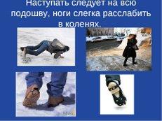 • Если Вы поскользнулись, присядьте, чтобы снизить высоту падения. В момент падения постарайтесь сгруппироваться, и, перекатившись, смягчить удар о землю. Не пытайтесь спасти вещи, которые несёте в руках. Не торопитесь подняться, осмотрите себя, нет ли травм, попросите прохожих людей помочь тебе.
