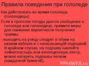 Гололед – слой плотного льда, образовавшийся на поверхности земли, тротуарах, проезжей части улицы и на деревьях, проводах, при замерзании воды. Гололеду обычно сопутствуют близкая к нулю температура воздуха, высокая влажность, ветер. Толщина льда при гололеде может достигать нескольких сантиметров. Гололёд — редкое явление природы по сравнению с гололедицей — скользкой дорогой.