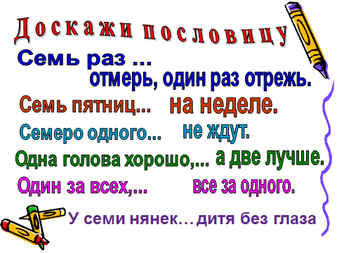 | 7 конкурс. «Доскажи пословицу» За каждую пословицу, команда получает 1 балл. Семь раз …… Семь пятниц …………. У семи нянек ……………. Семеро одного ……….. Одна голова хорошо ……… Один за всех……………..