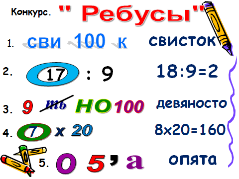 | 4 конкурс. «Ребусы» Условие конкурса: на экране 5 ребусов для обеих команд. Какая команда правильнее и быстрее разгадает ребусы. Каждый ребус – 1 балл. Проверка на экране, после сдачи листов ответов.