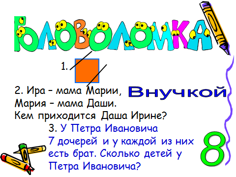 3.У Петра Ивановича 7 дочерей, и каждой из них есть брат. Сколько детей у Петра Ивановича? (8)