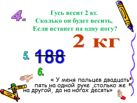 4. Гусь весит 2 кг. Сколько он будет весить, если встанет на одну ногу?
