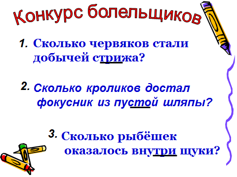 | 6 конкурс – болельщиков. Условие: на экране вопросы, в которых уже содержится ответ, надо быть внимательным и увидеть его. Жюри предстоит выбрать самого активного болельщика?