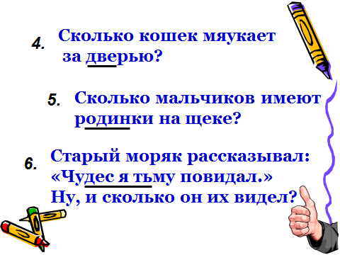 6. Мог ли человек написать о себе так: “У меня пальцев двадцать пять на одной руке, столько же на другой, да на ногах десять?” (Да, если после слова двадцать поставить двоеточие.) |