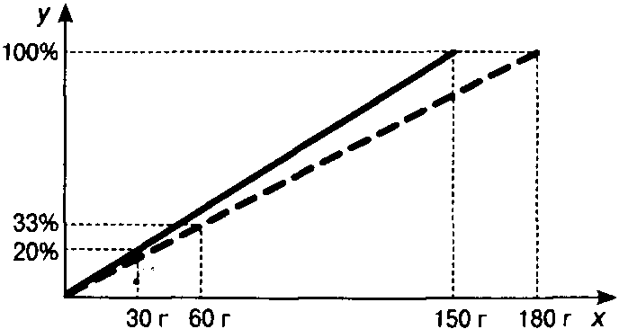 Для исходного раствора находим массу растворённого вещества (30 г). Затем строим новый отрезок для нового раствора, полученного в результате добавления соли к исходному. На оси Ох от точки, соответствующей массе исходного раствора, откладываем вправо 30 г (масса добавленной соли). Это масса полученного раствора. Восстанавливаем из неё перпендикуляр до пересечения с прямой, проходящей через отметку 100 % на оси Оу. Точку их пересечения соединяем с началом координат – получаем отрезок, соответствующий новому раствору (показан пунктирной линией). На оси Ох от точки, показывающей массу соли в первом растворе, откладываем вправо 30 г (масса добавленной соли) и получаем массу соли во втором растворе. Восстанавливаем из неё перпендикуляр до пересечения с пунктирным отрезком, а из точки пересечения – перпендикуляр на ось Оу. Значение равно массовой доле соли во втором растворе.