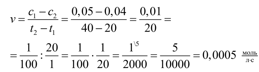 Пример 2. Вычислить среднюю скорость химической реакции*, если через 20 секунд от начала реакции концентрация веществ составляла 0,05 моль/л, а через 40 секунд – 0,04 моль/л.