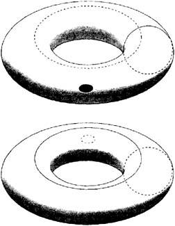 На наружной стороне тора проведем меридиан (рис, вверху). На внутренней стороне того же тора проведем параллель. Обе эти окружности, очевидно, сцеплены между собой. Вывернем теперь тор наизнанку через дырочку в его поверхности. Как видно из нижнего рисунка, первая окружность перейдет с наружной поверхности тора внутрь, а вторая — наружу, и обе окружности окажутся расцепленными. Очевидно, что это нарушает фундаментальный топологический закон, который гласит: разделить две сцепленные замкнутые кривые можно, лишь разорвав одну из кривых и протащив через место разрыва вторую.
