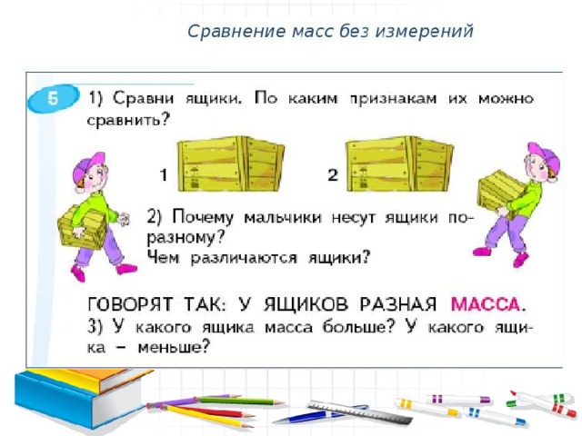 Нынче на уроке в классе Все узнали мы о массе. Знаем я, ты, он, она: Масса есть величина. И совсем это не сложно, И уже нельзя забыть, Что измерить массу можно, И, коль захотим, сравнить!