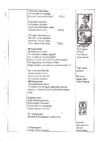 | І/Гапсырма. Жүмбақ шешу: 1 Арайланып күн атады, Ә геш энт е салады. Балалар да оянып, Бақшасына барадьг. Бүл қай уақытга болады? Асгіанда күн жарқырап, Серуенғе шықты балалар. Ізірі догггы тебеді, Бірі қүммен ойнайды. Ойнап болыгі балалар, |