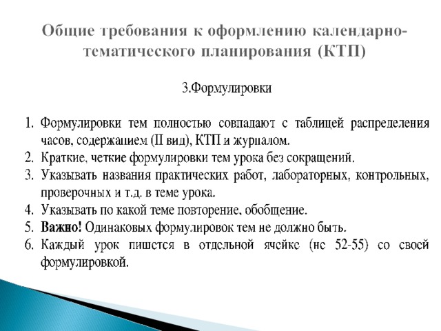 - использовать формулировки из КТП;