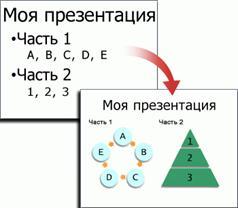 Анимация текста и объектовАнимация (Анимация. Добавление к тексту или объекту специального видео- или звукового эффекта. Например, можно создать элементы текстового списка, влетающие на страницу слева по одному слову, или добавить звук аплодисментов при открытии рисунка.) звуков, гиперссылок, текста, графики, схем, диаграмм и объектов (Объект. Таблица, диаграмма, рисунок, формула или данные другого типа. Объекты, созданные в одном приложении (например, электронные таблицы), а затем связанные или внедренные в другом приложении, являются объектами OLE.) подчеркивает различные аспекты содержания, управляет ходом изложения материалов и делает презентацию более интересной. Сведения об анимации рисунка SmartArt см. в разделе Анимация рисунка SmartArt.
