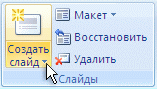 Совет. Если нужно, чтобы для нового слайда использовался тот же макет, что и для предыдущего слайда, просто нажмите кнопку Создать слайд, вместо того чтобы щелкать стрелку рядом с ней.