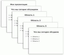 Если используется эта базовая структура, то при наличии трех основных представляемых тем или областей, можно планировать, что презентация будет содержать не менее шести слайдов: титульный слайд, вводный слайд, по одному слайду для каждой из трех основных тем или областей и итоговый слайд. (см. Рис 4)