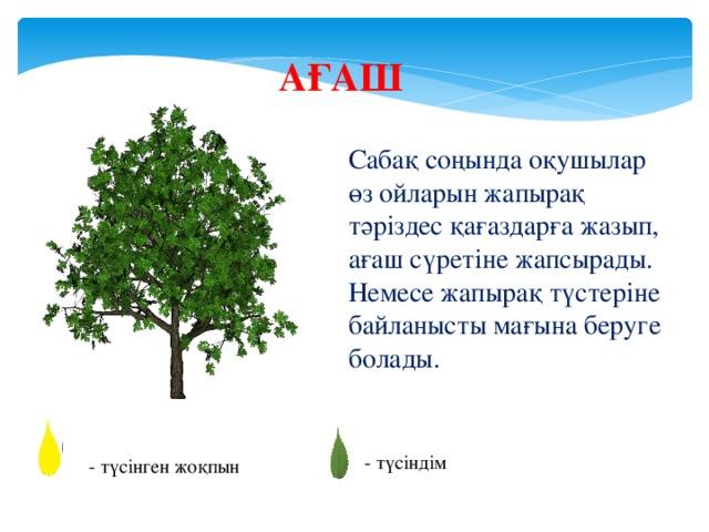 Сабақтан алған әсерлерін стикерге жазып, ағашқа жабыстырады. | |||||