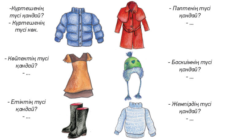 | Алдыңғы оқу. | Оқушылар киімдерінің суреттерін салады және жаңа сөздерді пайдалана отырып, атын, түсін атайды. Таныс сөздерді буынға бөліп оқиды және сөздердің мағынасын түсінеді