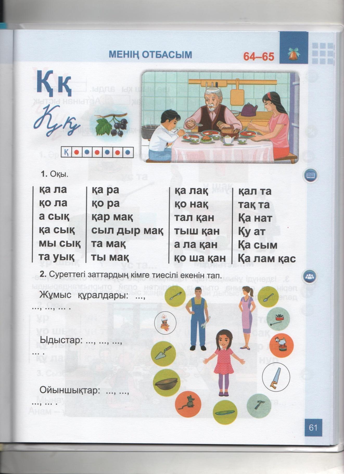 | Дәптермен жұмыс - Ққ әрпін ауада жазып үйрету, элементін пысықтау. -Үлгі дәптерге әріптерді жазу, - Сөздік диктант жазу. Суреттегі заттардың кімге тиесілі екенін тап. Белсенді оқу. ЖЖ. | жазу үлгісі
