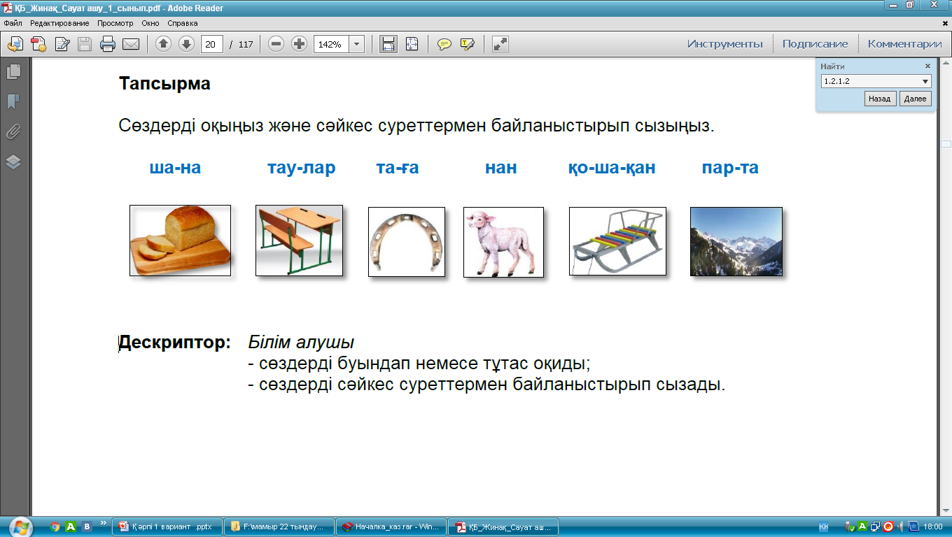 | Бағалау критерийлері: | Оқудың түрлерін (буындап оқиды, жиі кездесетін сөздерді тұтас оқи біледі, түсініп оқи алады) Берілген сюжетті сурет бойынша шағын әңгіме құрап айтады. |