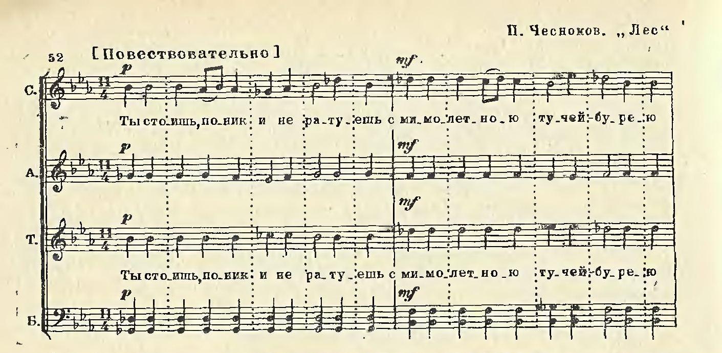 Примеры: Кюи Ц. «Воды», Чесноков П. «Листья», Чесноков П. «Ночь», Шостакович Д. «Родина слышит»