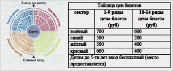 Ученики 4 класса Миша и Маша планировали на посещение яркого современного технологичного шоу «Снежная королева» потратить 1400 рублей. На сувениры и буфет можно потратить 300 рублей. Изучи таблицу свободных мест, выбери наилучшие места (в одном секторе, ближе всего к арене), на которые можно приобрести билеты на оставшуюся сумму. Учти, что Миша и Маша должна сидеть на соседних местах.